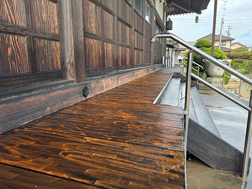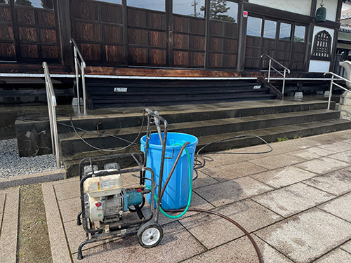 本堂の縁側を高圧洗浄機で清掃し、積年の汚れを落としました。